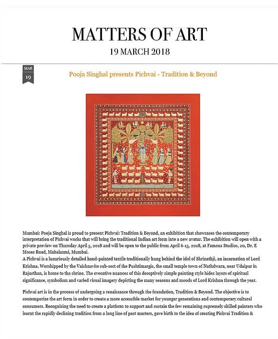 Matters of Art Pooja Singhal presents Pichvai - Traditional & Beyond Mar 19, 2018