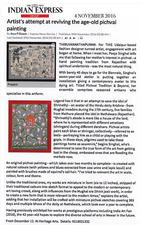 The New Indian Express Pooja Singhal's upcoming collateral project at Kochi-Muziris Biennale attempts to restore age-old Pichvai tradition Nov 04, 2016