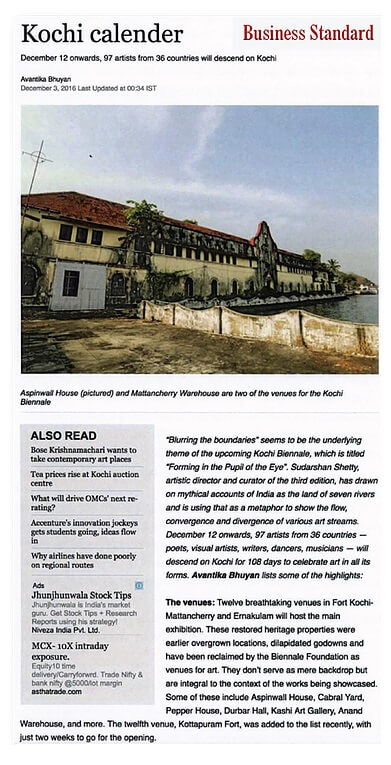 Business Standard December 12 onwards, 97 artists from 36 countries will descend on Kochi Dec 03, 2016