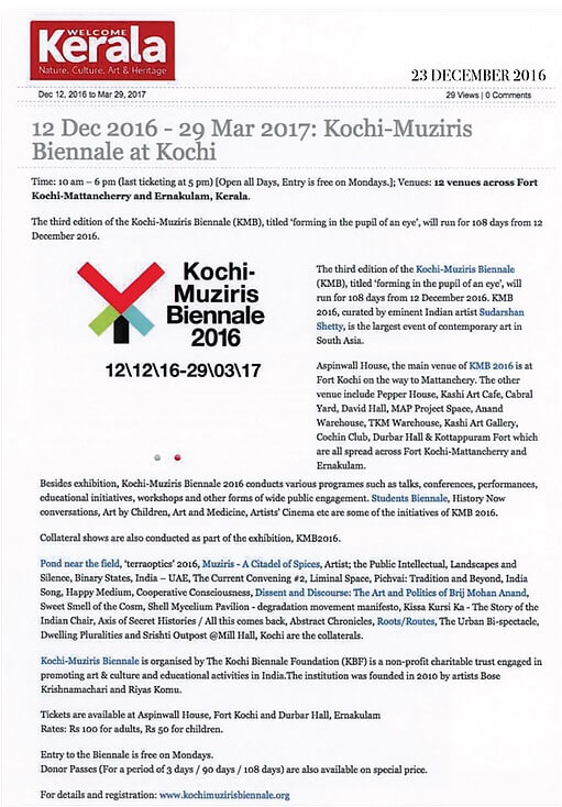 Welcome Kerala 12 Dec 2016 - 29 Mar 2017: Kochi-Muziris Biennale at Kochi Dec 23, 2016