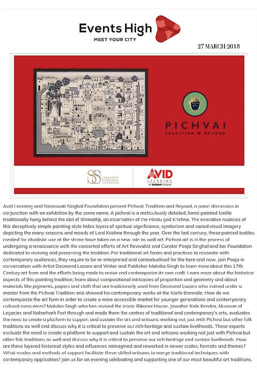 Events High Avid Learning and Saraswati Singhal Foundation present Pichvai Tradition and Beyond Mar 27, 2018